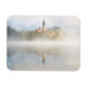 Imã fotográfico retangular com um nascer de sol embaçado no lago Bled com reflexo da ilha com a igreja na água do lago e com o Castelo Bled ao fundo num belo dia de outono na Eslovênia.