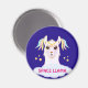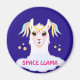 Ímã de lhama espacial fofa. A lhama espacial é decorada com fitas e joias em fundo azul índigo. O texto pode ser personalizado.