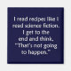 Celebre sua falta de habilidades de cozinhar! Lê "Eu leio receitas como eu leio ficção científica. Chego ao fim e penso, "Isso não vai acontecer." Disponível em impressão verde, vermelho ou branco.