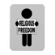Esta design apresenta um manifestante segurando um sinal de liberdade religiosa.