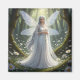 Uma bela fada vestindo um vestido branco fluido e um colar feito de diamantes com margaridas e diamantes em seu longo cabelo branco-prateado e asas brancas iridescentes como a libélula, segurando uma margarida em uma floresta mágica cercada por margaridas e mussas cobertas.
