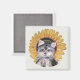 Pintura única de um lindo cão Yorkshire Terrier sentado em frente a um girassol em um fundo prateado claro.