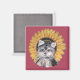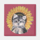 Pintura única de um lindo cão Yorkshire Terrier sentado em frente a um girassol em um fundo burgundy.