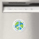 Um imã de geladeira com um design original de um gráfico estilizado da terra cercado por um sinal branco de paz. A palavra "Paz" rodeia o mundo em várias línguas.