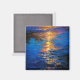 Golden light shimmers across deep blue water in an expressive, impressionistic reflection of twilight.