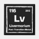 This design features a bordered square mimicking an element tile, with the atomic number "116" at the top left, atomic mass "293" at the top right, the symbol "Lv," the full name "Livermorium," and the classification "Post-Transition Metal" underneath. It’s fun for scientists and students because it playfully celebrates the superheavy, synthetic element Livermorium, turning obscure nuclear-physics trivia into wearable geek chic. It also signals insider pride in the quest to expand the periodic table.