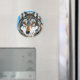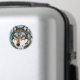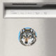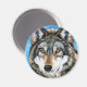Uma pintura acrílica de um lobo cinza sobre um fundo azul.