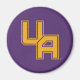 O logotipo das iniciais da Universidade de Albany apresenta um design "UA" arrojado e dinâmico, reproduzido na assinatura roxa da universidade e esboçado com uma impressionante borda dourada. As letras angulares, em bloco, dão ao logotipo uma aparência forte e autoritativa, perfeita para representar o orgulho e a identidade da escola. A estrutura simétrica e geométrica das letras transmite uma estética moderna e profissional.