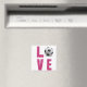 Love Soccer word design com letras faíscas cor-de-rosa quente e o "o" é substituído por uma bola de futebol.