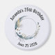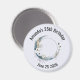 Aniversário salve o ímã de data/manutenção com uma ilustração mística. Uma lua azul escura com um contorno fino elegante e flores brancas ao longo das suas bordas.