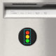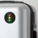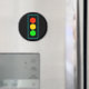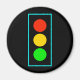 Representação gráfica em negrito da luz do sinal de controle de tráfego, em vermelho, amarelo e verde, com borda azul-clara, sobre fundo preto.