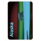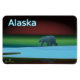 Um urso polar vagueia o gelo durante a longa noite polar; o Norte brilha em vermelho e verde à distância. A leitura de texto "Alaska" em azul e branco brilhantes também é exibida.