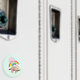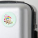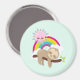 Um ímã com uma ilustração com uma preguiça castanha engraçada e feliz pairando em um galho de árvore. Um arco-íris colorido atrás dele junto com um sol rosa pairando sobre a cabeça. Bonita, adorável e moda.