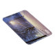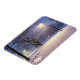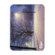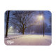 Vista da paisagem noturna de inverno. Vista de coberto de árvores de neve no parque e luzes de rua em Riga, Letónia.