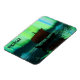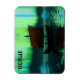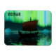 Uma imagem ligeiramente estilizada de um navio de longa distância Viking navegando à noite sob as Luzes do Norte ali um casal de icebergs; a maioria da tripulação está dormindo. A leitura de texto "VIKINGAR" (Vikings) também é exibida.