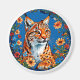 Lynx com pele laranja vibrante que apresenta pontos distintos. O lince tem óculos amarelos brilhantes e tufos proeminentes de pelo em seus ouvidos. Está rodeado por uma exibição viva de flores coloridas, incluindo tons de azul, amarelo e vermelho, colocados sobre um fundo azul em negrito. A composição global mistura elementos naturais com um talento artístico, destacando tanto a beleza do lince como o arranjo floral. Isto cria uma cena visualmente deslumbrante e harmoniosa.