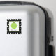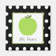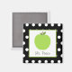 Um ímã personalizado com uma ilustração de um dentro de maçã verde um quadrado branco com forma verde. O fundo é preto com bolinhas brancas.