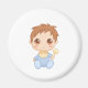 Bebê de desenho animado fofo vestido com um macacão azul com um babador amarelo segurando um chocalho de bebê.