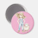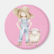 Rosa Magnet mit Mädchen in Jeanslatzhose und Hut und einem kleinen Lamm.