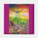 Pintura acrílica colorida e vibrante em verde, amarelo alaranjado, roxo, castanho vermelho, cores brancas de 2009, Duelo entre Bradamant e Negromcer em seu grifão com asas enormes. Orlando Furioso, Canto 2 escrito pelo poeta Renascentista italiano Ludovico Ariosto 1516 .