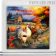 Magneta de cozinha apresentando uma pintura colorida de arte fina de uma cena de fazenda rural com galo e galinha. Uma adição alegre a qualquer cozinha e um presente adorável para alguém que gosta de cozinhar.