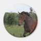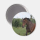 Cavalo de baía num campo num ímã.