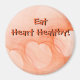 Um desenho abstrato laranja de corações com as palavras Comer o Coração Saudável! num ímã redondo.