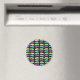 Este ímã apresenta uma série de diferentes porcos de desenho animado coloridos. Cada um tem a cabeça para baixo, pronto para engolir qualquer comida que encontrar. Os porcos estão em linhas alternadas de verde e amarelo e roxo e azul. O fundo é preto.