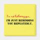 Este ímã amarelo, preto e vermelho diz, "Não estou incomodando você... Eu só estou te lembrando repetidamente."