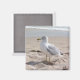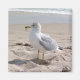 Um ímã criado de uma fotografia de um gaivota da Flórida coloca-se na areia da praia enquanto as ondas se enrolam calmamente.