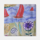 Em um dia ensolarado de verão, a colina que olha para o mar está coberta de flores lindas e coloridas. Há uma forte brisa quente e muitos barcos com velas vermelhas brilhantes navegam nas águas azuis da baía. Esta é uma aquarela vibrante e alegre que trará um salto de cor brilhante para sua casa.