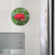 ímã redondo (disponível também em forma quadrada, e outros tamanhos e preços) com fotografia de zinnia vermelha e uma mante de oração gravada sobre ela