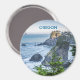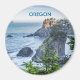 A luz do sol matinal tocando uma porção robusta da costa do Oregon no ponto de vista de Arch Rock perto de Brookings. Várias pilhas sombreadas de mar saem das águas do oceano aquamarino, franzidas por surf em sua base e enfeitadas com pinheiros altos em seus picos ensolarados. Pequenas chaminés marítimas saem de águas iluminadas pelo sol no horizonte distante e nebuloso que se funde gradualmente num céu azul claro. O primeiro plano é dominado por vergreens e gramíneas verdes escuras, pontuados por um aglomerado de flores violetas coloridas e íris amarelas.