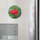 Íman redondo com fotografia de zinnia vermelha e mantis rezante amarrados em cima dela