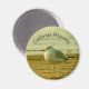 A gaivota parada numa perna, na praia ao pôr do sol. O texto curvo acima diz "Sonho na Califórnia"