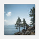 Uma fotografia de um grupo de pinheiros numa colina rochosa sobre o lago Tahoe.