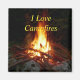Fotografia de uma fogueira feita de paus, cercada por pedras, queimando contra a noite escura. O texto personalizável diz: "Eu amo os foguetes."