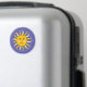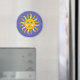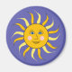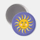 Esta bela design de imã de geladeira apresenta uma design de arte solar celestial num círculo azul. Um presente encantador para aqueles que amam um tema "sol, lua e estrelas". Também disponível em uma Lua Celestial e design de Estrelas.