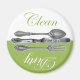 Magneta de máquina de lavar louça verde e branca "limpa e suja" com pratos de prata antigos. Cortesia gráfica da Fada Gráfica.