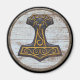 Um ímã com o clássico design de martelo de Thor sobre o fundo do escudo de viking de madeira lindamente curvado.