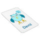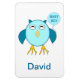 Este incrível ímã apresenta um desenho fofo de uma coruja azul com olhos sonolentos, um bico largo e penas fofinhas. A coruja está segurando um balão azul em pó. Há texto azul pálido dentro no balão que diz, "Bebê rapaz". Este é o presente perfeito para celebrar um bebê recém-nascido. Há texto aceitável abaixo da imagem para que você possa incluir o nome do seu bebê.