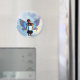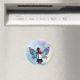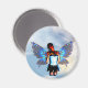 Fada digital, em tons de laranja com asas azuis brilhantes, e vestida em tons de azul, ajoelhados no céu.