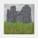 Uma cena 3D criou em Vue, mostrando o local de uma batalha antiga, com apenas as ruínas desmoronantes de uma torre de pedra medieval e flores vermelhas na grama para comemorar. A chuva em queda e o efeito de aquarela macia aumentam a tristeza da cena do topo da colina.