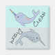 Uma maneira de marcar se os pratos estão limpos ou sujos na máquina de lavar louça. Ambos os lados têm um belo narval. O lado sujo tem um narval de cinza em um fundo de cinza. O lado limpo tem um arco-íris em um fundo azul claro.