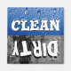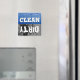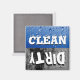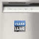Magneta de cozinha limpa e suja, bonita e única, com bolhas cintilantes azuis, com a palavra "CLEAN" em texto branco em uma metade e um fundo cinza com a palavra "suja" em texto grande e fácil de ver na outra metade. A solução divertida de quando carregar e quando esvaziar a máquina de lavar louça.