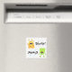 Bonito e divertido impecável - imã de máquina de lavar louça suja com dois monstros de animação felizes, um verde com listras e um amarelo com pontos laranja. Texto "Limpo" e "Sujo".