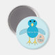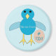 Este ímã divertido apresenta um desenho fofo de um pintinho azul. O pintinho tem uma barriga azul pálida e asas azuis mais escuras e cabeça com um bico e pés amarelos. Ao lado do pintinho está um ovo pequeno. Há texto personalizável para que você possa personalizar este design com a idade e o nome do destinatário.