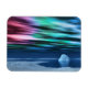 Na baía de uma terra congelada, um icebergue excelente flutua no mar azul frio. Flocos de neve e estrelas espetam a cena, e no céu acima, a aurora brilha em tons de rosa, lavanda, verde e azul.