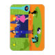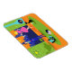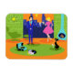 Este Casal da Noite Romântica Flexível do Retro Magnet parece uma cena de uma comédia romântica de 1960. A design minimalista apresenta um atraente casal de desenho animado na sala de estar de um meio século moderno e urbano. A sala apresenta, de forma destacada, uma parede verde de pedra com uma janela do chão até o teto, com vista à sua visualização. Através da janela, podemos ver a silhueta azul de um horizonte de uma cidade grande. Uma lua crescente é visível no céu laranja do pôr do sol. As mobílias na sala incluem uma cadeira verde, salgada, com fezes correspondentes, uma luminária amarela, sputnik, e uma lareira em forma de cone, cheia de fogo em chamas. No centro do pavimento laranja, há um tapete redondo, verde de haste. Um toca-discos, turquesa e preto, portátil, é colocado no tapete. Ao lado do toca-discos, um registro de vinil pode ser visto a saltar de um cobrir de álbum de kitschy. Também no tapete, há um gato preto e elegante vestindo uma coleira de chá. Este felino rico está sentado em frente a um copo de martini. Aproveitando esta cena, temos um casal muito sofisticado. Há um homem de tenda vestindo um terno azul, camisa azul clara e gravata vermelha. O homem alto, escuro e bonito está apreciando a companhia de uma loura elegante. A adorável senhora está vestindo um vestido rosa quente com um corpo apropriado e saia fria. Cada um deles segurando um vidro de cristal martini com uma azeitona flutuante. Saúde! Aqui está a noite perfeita em casa!