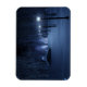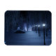 Um caminho coberto de neve que percorre a floresta de pássaros em uma noite escura de inverno. O caminho é alinhado com postes que exibem um brilho azul prateado, mas nas sombras estão formas brilhantes e mesmerizantes como pequenas luzes de fada, atraindo o viajante para fora da trilha. À distância, o brilho lavanda de uma misteriosa floresta se juntando ilumina o céu frio.